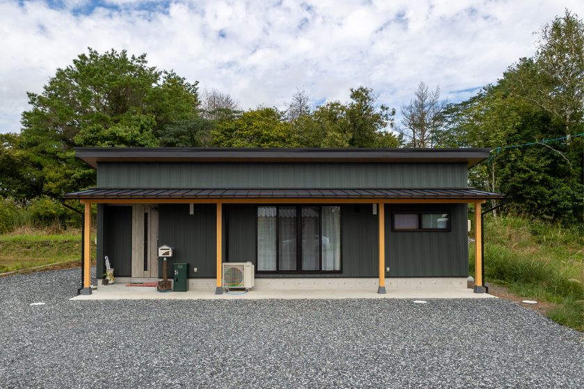 外観は、深みのあるダークグリーンを基調とした落ち着いた佇まい。内装は、白と木のコントラストが美しく、天井や梁の存在感が空間に立体感を与えています。